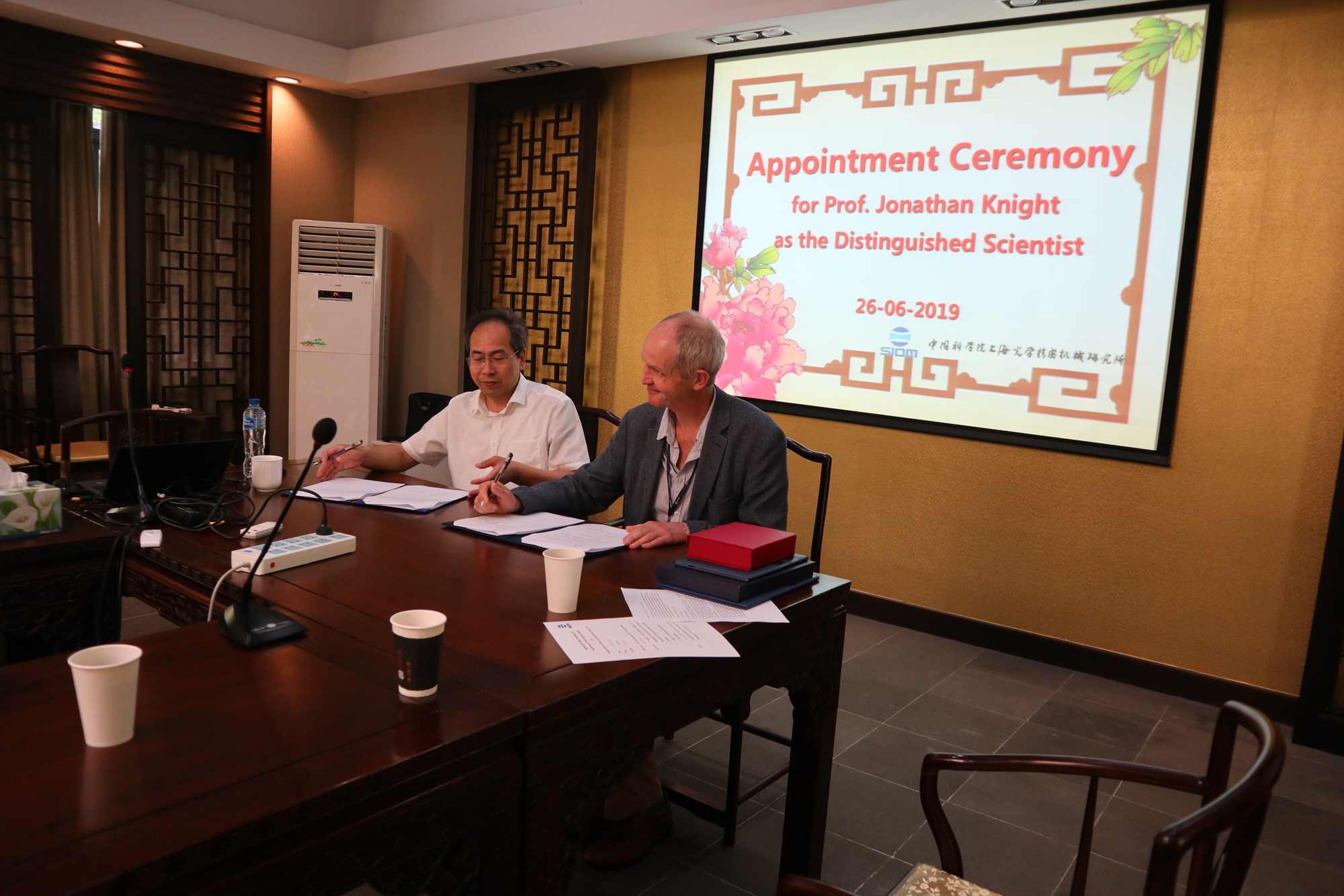 在报告中,Jonathan Knight教授系统梳理了以光子晶体光纤的发展历程,介绍并展望了以微结构光纤为基础的新一代光电子技术的发展趋势,重点介绍了目前在工业激光技术、国防安全和医疗健康领域的重要成果。论坛开始前,陈卫标向Jonathan Knight教授颁授“2019年中国科学院国际杰出学者”荣誉证书,并签署聘用合同,正式聘任Jonathan Knight为上海光机所荣誉教授。