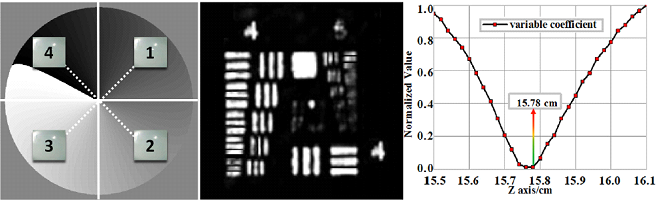 图1涡旋光的相移干涉区域(左),分辨率板的重构像(中)及自动对焦曲线(右)
