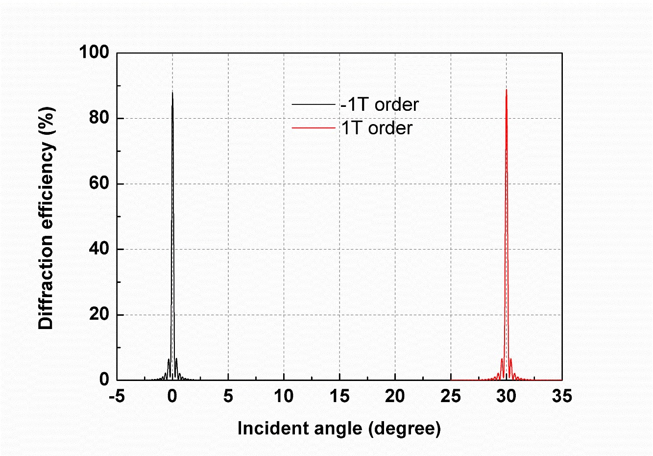图3. 不同入射角度下的-1级和1级衍射效率曲线(TE偏振)