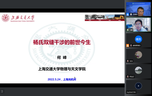 5月24日19:30-21:00,上海光机所在线举办第十二期“尚光·奋斗”云讲坛。本次讲坛邀请上海交通大学物理与天文学院教授、致远学院副院长、博士生导师何峰作 。会议由上海光机所副所长冷雨欣主持,所内外近300名师生参加。